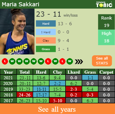Sakkari has a solid match record in the last 8 years having won 60% of her matches (337-222). 13-6 on hard in 2021. Regarding her performance on the same surface of this tournament, Sakkari has a compiled155-108 match record in the last 8 years on hard.