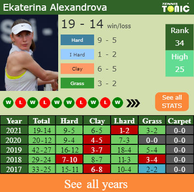 The Russian has an aggregate 19-14 win-loss record in 2021, 9-5 on hard (See FULL STATS).