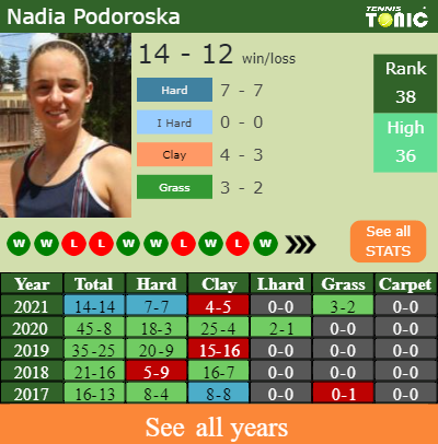 Podoroska has a composed 14-14 win-loss record in 2021, 7-7 on hard (See FULL STATS).