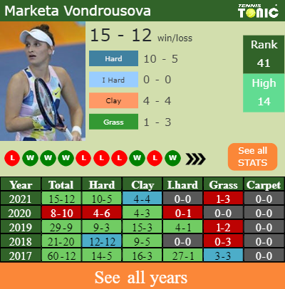Vondrousova has a fantastic record in the last 8 years having won 70% of her matches (180-78). 10-5 on hard in 2021. In connection with her performance on the same surface of this competition, Vondrousova has a compiled55-32 record in the last 8 years on hard.