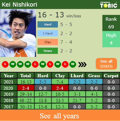 Kei has a compiled 16-13 win-loss record in 2021, 5-5 on hard (See FULL STATS).