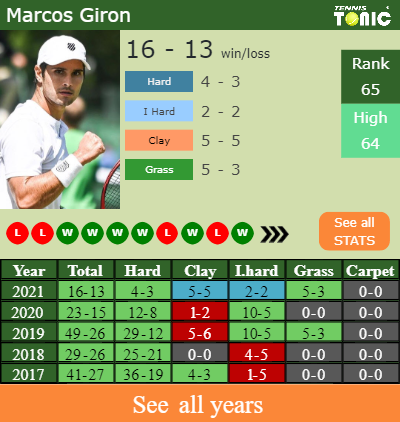 Giron has a solid match record in the last 10 years having won 62% of his matches (272-169). 4-3 on hard in 2021. In connection with his performance on the same surface of this tournament, Giron has an overall 203-113 match record in the last years on hard.