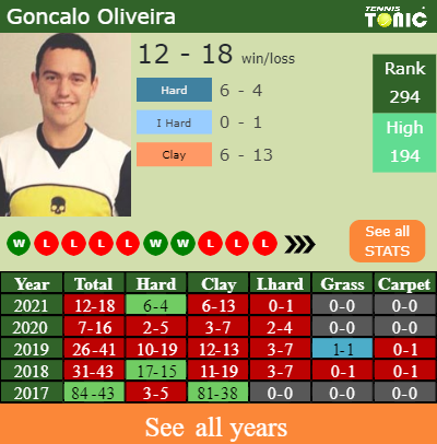 In terms of his career, Oliveira has an overall 359-318 record. He has a negative 59-71 record on hard.
