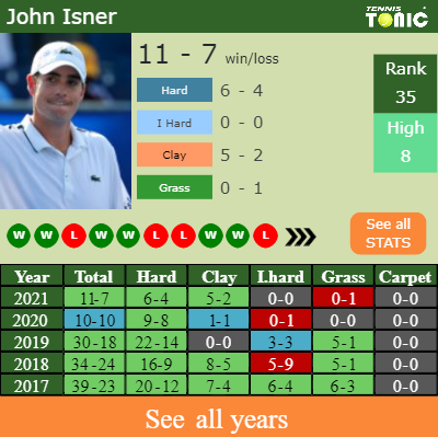 Isner has an aggregate 11-7 win-loss record in 2021, 6-4 on hard (See FULL STATS).