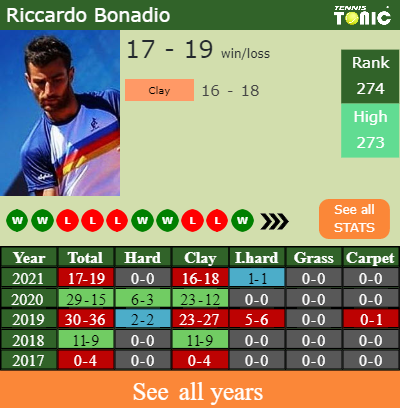 Bonadio has a winning match record in the last 7 years having won 52% of his matches (102-93). 16-18 on clay in 2021. Regarding his performance on the same surface of this event, Bonadio has an aggregate84-77 record in the last 7 years on clay.