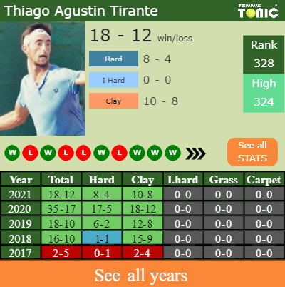 Agustin has an overall 18-12 win-loss record in 2021, 10-8 on clay (See FULL STATS).