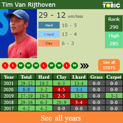Van Rijthoven has an aggregate 29-12 win-loss record in 2021, 10-5 on hard (See FULL STATS).