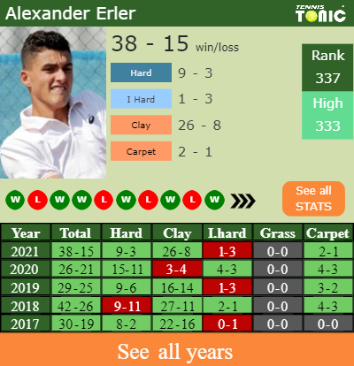 Alexander has a composed 38-15 win-loss record in 2021, 26-8 on clay (See FULL STATS).