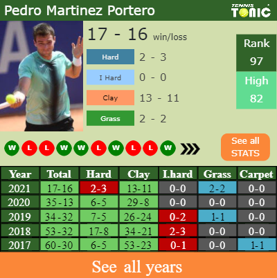 Pedro has an aggregate 17-16 win-loss record in 2021, 13-11 on clay (See FULL STATS).