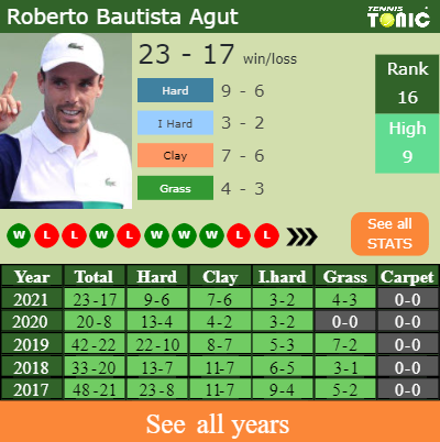 The Spaniard has an overall 23-17 win-loss record in 2021, 7-6 on clay (See FULL STATS).