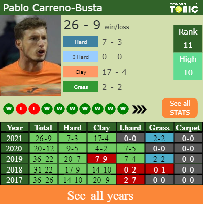Carreno-Busta has an aggregate 26-9 win-loss record in 2021, 7-3 on hard (See FULL STATS).