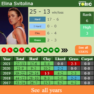 Svitolina has an aggregate 27-13 win-loss record in 2021, 17-6 on hard (See FULL STATS).