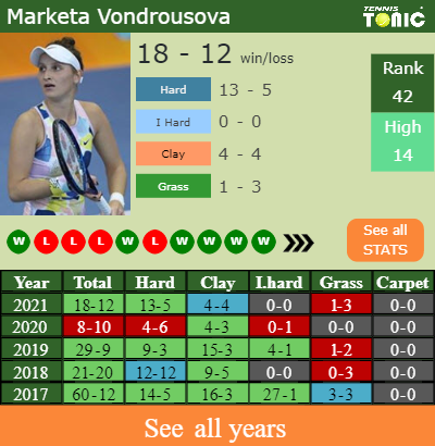 Vondrousova has an overall 18-12 win-loss record in 2021, 13-5 on hard (See FULL STATS).
