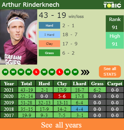 Rinderknech started his run at this tournament from the qualifications. In the main draw, he has conceded 1 set in the tournament to win 53% of the points he played.