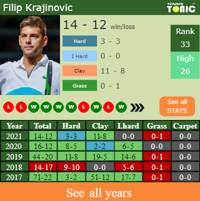 Krajinovic has a solid record in the last 10 years having won 65% of his matches (346-183). 11-8 on clay in 2021. Regarding his performance on the same surface of this event, Krajinovic has an aggregate 205-79 win-loss record in the last years on clay.