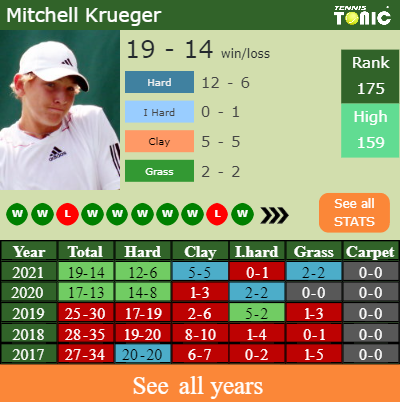 Krueger has a good match record in the last 10 years having won 54% of his matches (311-269). 12-6 on hard in 2021. Regarding his performance on the same surface of this competition, Krueger has an overall 195-163 match record in the last years on hard.
