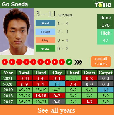 Soeda has an overall 3-11 win-loss record in 2021, 1-4 on hard (See FULL STATS).