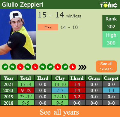 Zeppieri has an overall 15-14 win-loss record in 2021, 14-10 on clay (See FULL STATS).