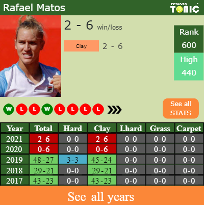 Rafael has a composed 2-6 win-loss record in 2021, 2-6 on clay (See FULL STATS).