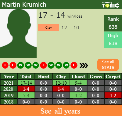 The Czech has an aggregate 17-14 win-loss record in 2021, 12-10 on clay (See FULL STATS).