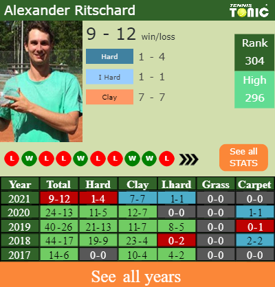 Talking about his overall career, Ritschard has an overall 207-128 record. He has a positive 119-60 record on clay.