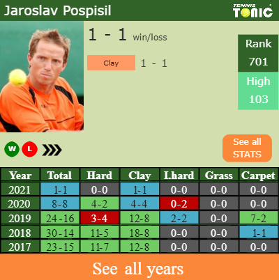 Jaroslav has an overall 1-1 win-loss record in 2021, 1-1 on clay (See FULL STATS).