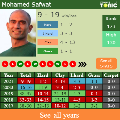 Talking about his overall career, Safwat has an overall 414-272 record. He has a positive 194-131 record on clay.