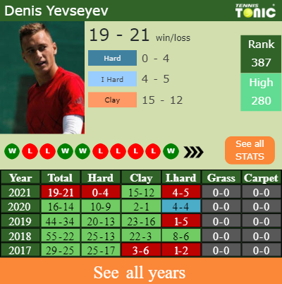 Denis has an aggregate 19-21 win-loss record in 2021, 15-12 on clay (See FULL STATS).
