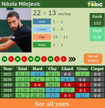 Milojevic has a composed 22-13 win-loss record in 2021, 19-11 on clay (See FULL STATS).