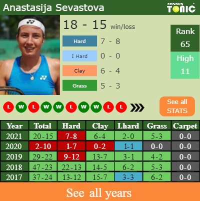 Sevastova has an aggregate 20-15 win-loss record in 2021, 7-8 on hard (See FULL STATS).
