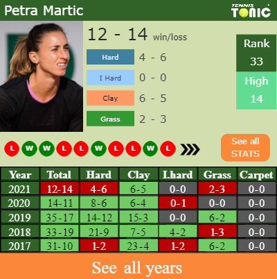 Martic has a composed 12-14 win-loss record in 2021, 4-6 on hard (See FULL STATS).