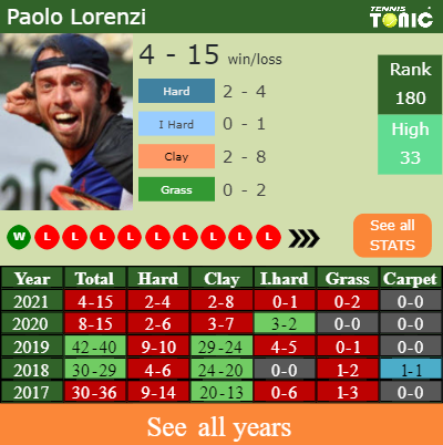 Paolo has an overall 4-15 win-loss record in 2021, 2-8 on clay (See FULL STATS).
