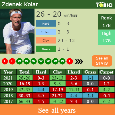 This will be the 3rd time that Zdenek Kolar and Paolo Lorenzi square off. The head to head is 1-1 (see full H2H stats), 1-0 on clay.