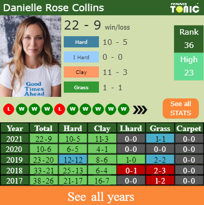 Collins has an overall 22-9 win-loss record in 2021, 10-5 on hard (See FULL STATS).