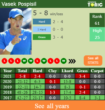 Vasek has a composed 5-8 win-loss record in 2021, 2-4 on hard (See FULL STATS).