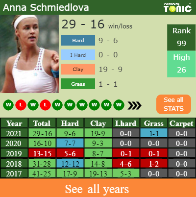 Anna Schmiedlova has a solid win-loss record in the last 10 years having won 60% of her matches (312-209). 19-9 on clay in 2021. Regarding her performance on the same surface of this tournament, Anna Schmiedlova has an aggregate 158-79 win-loss record in the last years on clay.