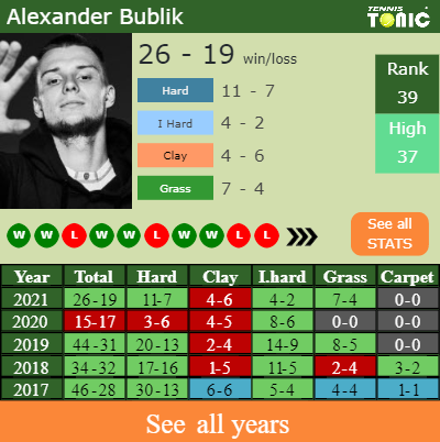 Bublik has a compiled 26-19 win-loss record in 2021, 11-7 on hard (See FULL STATS).
