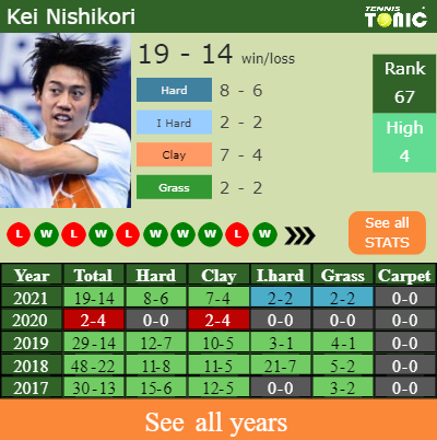Kei has an aggregate 19-14 win-loss record in 2021, 8-6 on hard (See FULL STATS).