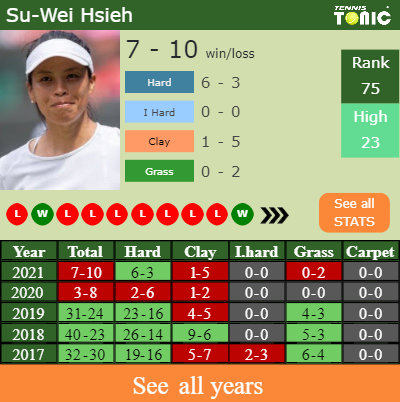 Hsieh has a positive record in the last 10 years having won 56% of her matches (259-203). 6-3 on hard in 2021. Talking about her performance on the same surface of this event, Hsieh has an overall 182-123 match record in the last years on hard.