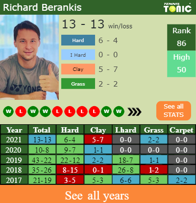The Lithuanian has an aggregate 13-13 win-loss record in 2021, 6-4 on hard (See FULL STATS).