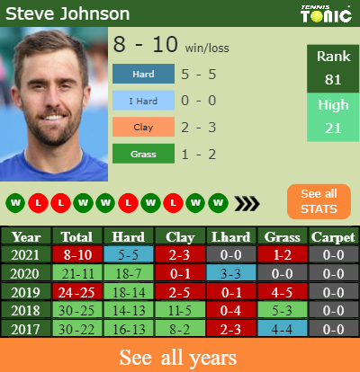 Steve has a composed 8-10 win-loss record in 2021, 5-5 on hard (See FULL STATS).