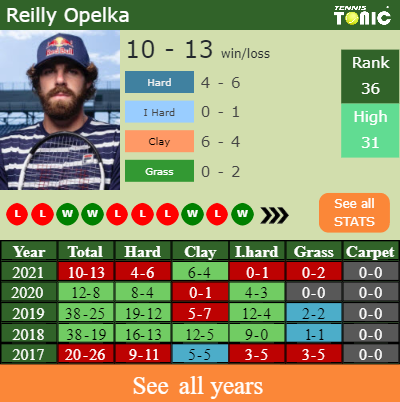 Opelka has a winning win-loss record in the last 8 years having won 56% of his matches (177-137). 4-6 on hard in 2021. In connection with his performance on the same surface of this competition, Opelka has an aggregate81-70 match record in the last 8 years on hard.