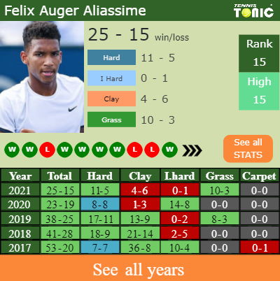 Felix has an overall 25-15 win-loss record in 2021, 11-5 on hard (See FULL STATS).