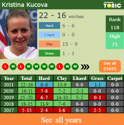 Kucova has a winning record in the last 10 years having won 58% of her matches (244-178). 15-9 on clay in 2021. Talking about her performance on the same surface of this competition, Kucova has a compiled 157-82 win-loss record in the last years on clay.