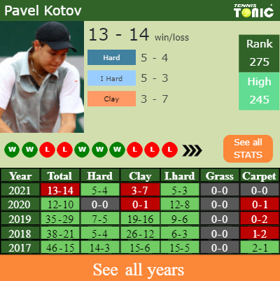 Talking about his overall career, Kotov has an overall 154-97 record. He has a positive 66-46 record on clay.
