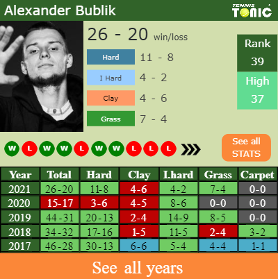 Bublik has a composed 26-20 win-loss record in 2021, 11-8 on hard (See FULL STATS).