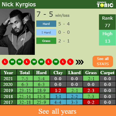 Kyrgios has a compiled 7-5 win-loss record in 2021, 5-4 on hard (See FULL STATS).