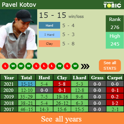 The Russian has an aggregate 15-15 win-loss record in 2021, 5-8 on clay (See FULL STATS).