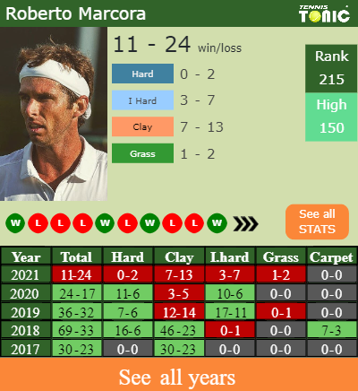 Marcora has a positive record in the last 10 years having won 59% of his matches (387-266). 7-13 on clay in 2021. Regarding his performance on the same surface of this competition, Marcora has an overall 242-152 match record in the last years on clay.