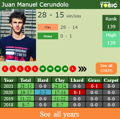 The Argentine has an aggregate 28-15 win-loss record in 2021, 28-14 on clay (See FULL STATS).